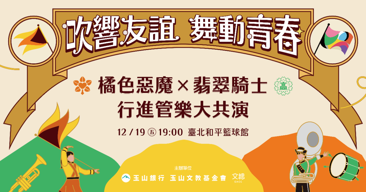 「2025台灣遠征──吹響友誼,舞動青春」由玉山銀行、玉山文教基金會與文化總會共同舉辦。兩校將以逾250人的盛大編制來台展開系列活動。12月19日晚上於台北和平籃球館登場的「橘色惡魔X翡翠騎士 行進管樂大共演」,將以磅礡的音樂與熱血的步伐,展現日本高校行進管樂的極致魅力。開場表演特別邀請「莊敬高職樂旗隊」同台演出。這場匯聚青春、熱血與友情的音樂盛會,將成為台日行進管樂文化交流的新里程碑。